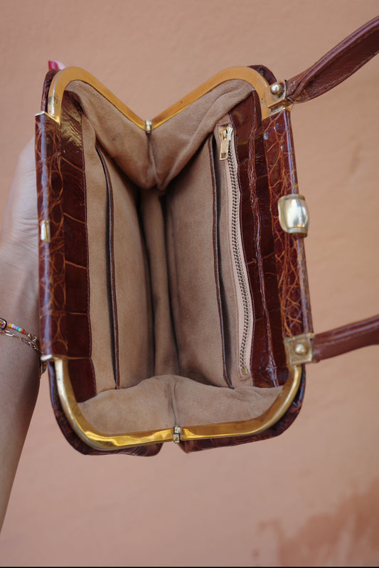Vintage 1940s Glossy Toffee Crocodile Skin Handbag